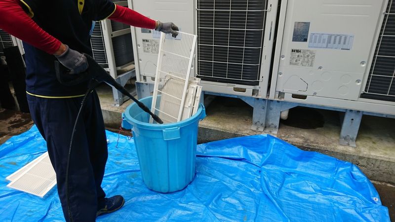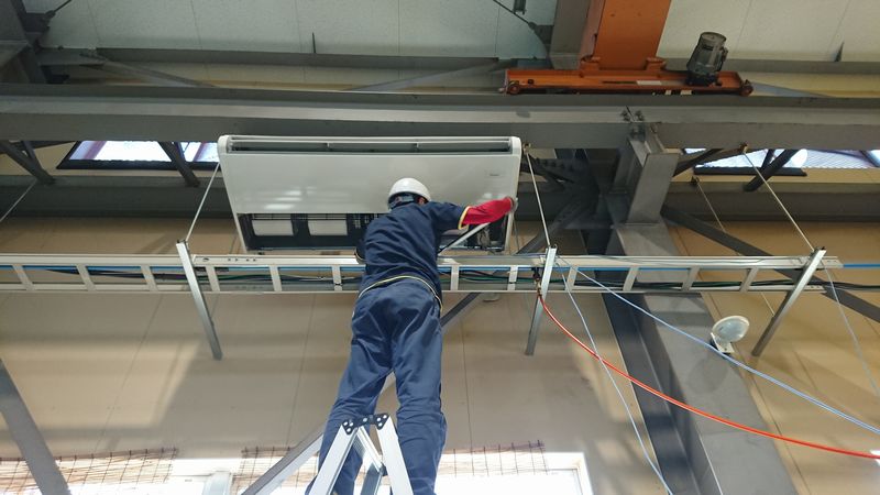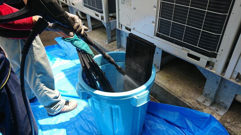 高所にあるエアコン6台分のフィルターの脱脂・目詰まり解消作業