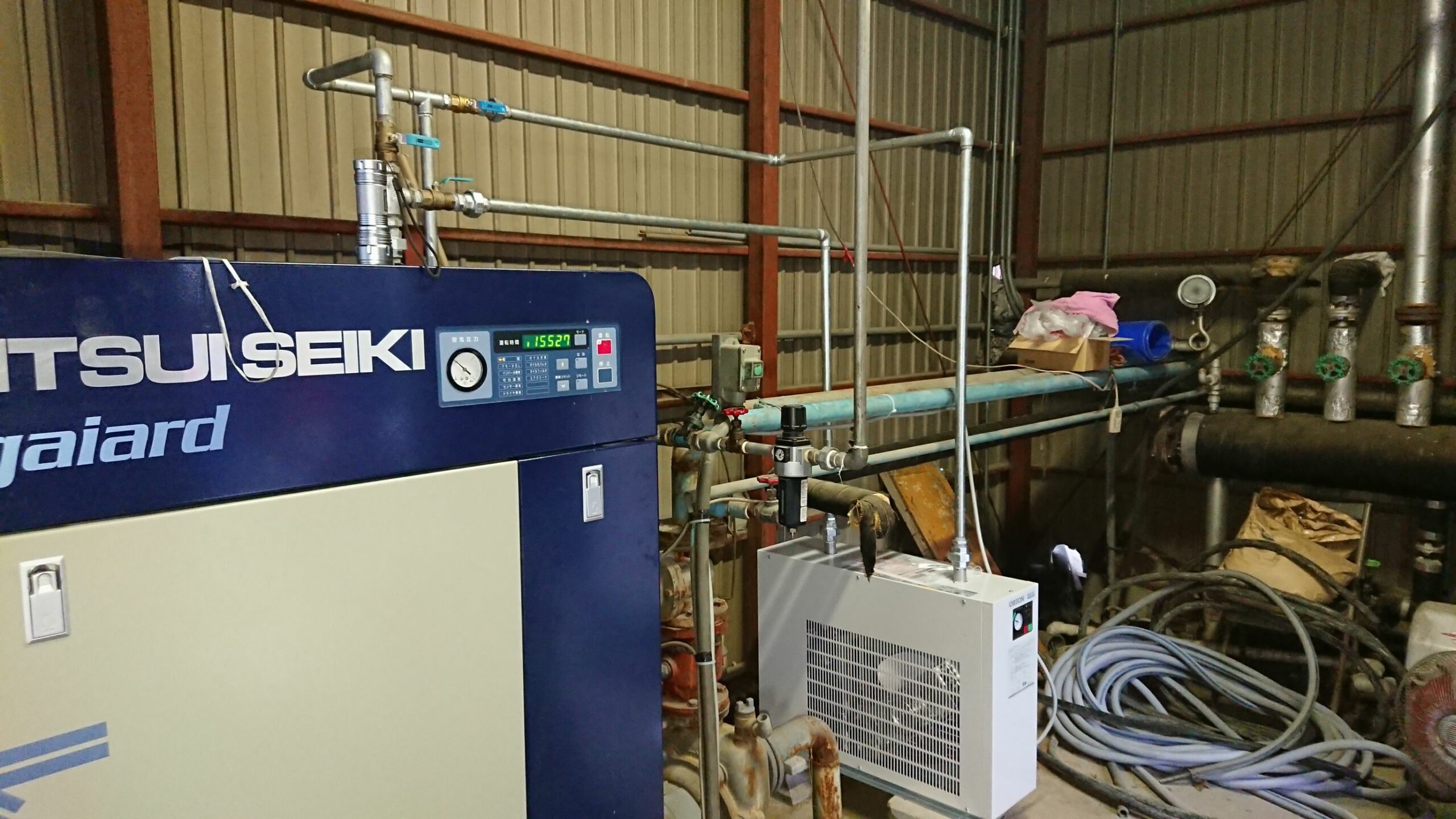 長年使っているコンプレッサの内蔵エアドライヤーが故障しました。内蔵のドライヤはだいぶ高価なものでしたので、今回は隣にドライヤーを別に設置する事を提案しご採用頂きました。(コスト的には別置きの方が安価でした。)併せて追加配管工事行いました。今後ドライヤが故障してもエアーを止めないようにバイパス配管も設置しました。