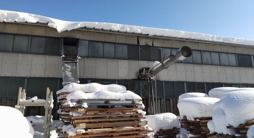 水を含んだ雪が工場の屋根から落ちる際に排気ダクトと煙突に影響を受けて傾いてしまい、最終的にに折れてしまいました。一緒に屋根の雪止めも地面に落ちてしまいました。ボイラーに繋がっている場所でしたので、ラインを止めざる得ない状況となりました。小沢商店で緊急の対応をして、最小限の日数での排気ダクトと煙突の再設置を行う事が出来ました。時には予想だにしないトラブルが起こります。今後もお客様の製造ラインを守る為にも出来る限りの最大限の協力をしてまいりたいと思います。