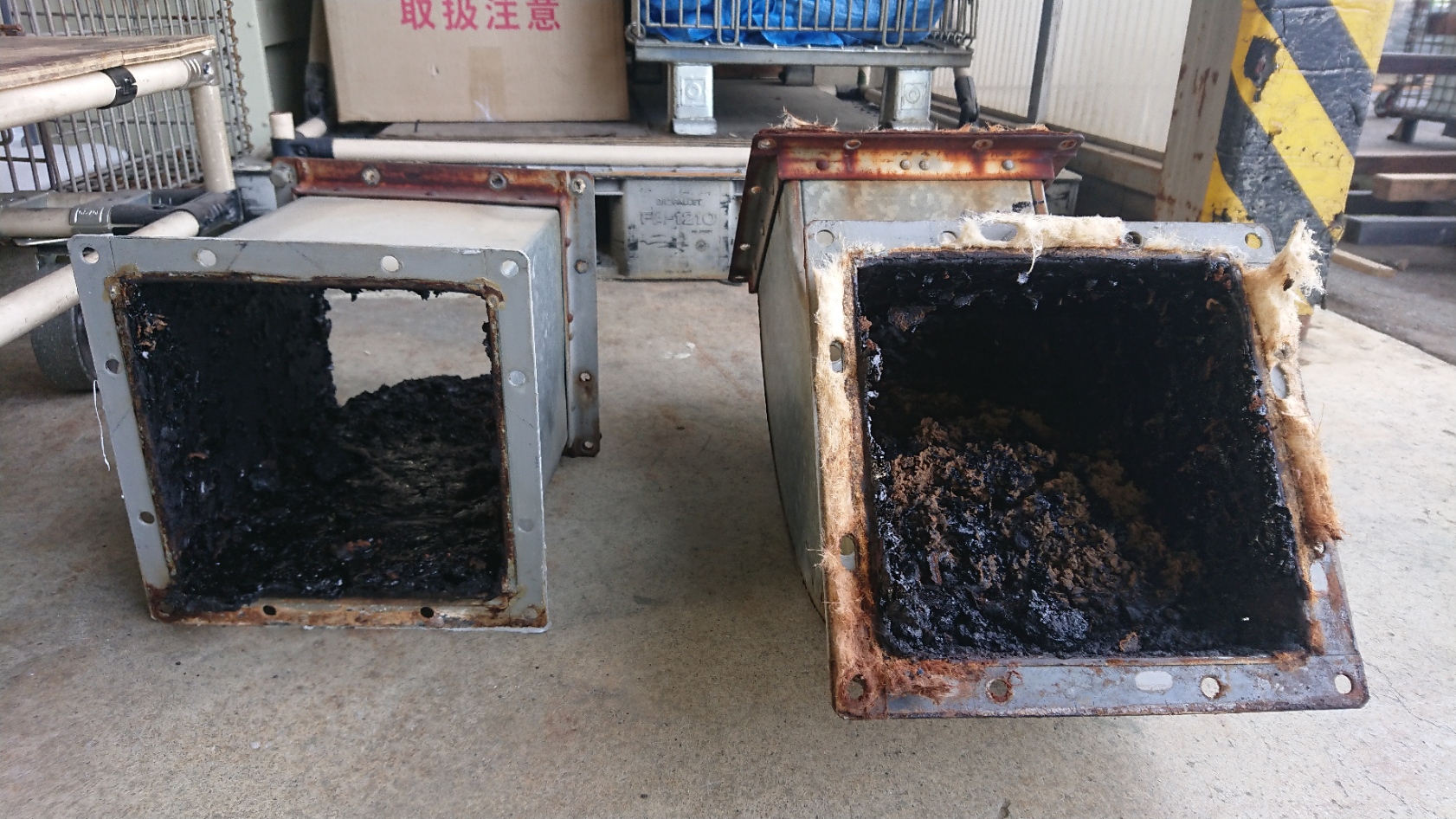 乾燥炉に排気が逆流してくる症状が出ており、排気ダクトが詰まっているのが濃厚でしたので今回排気ダクトを全て交換することとなりました。既設ダクトと外してみると添付写真のようにダクト内部がこのような状態となっておりました。交換後は問題なく排気がされております。