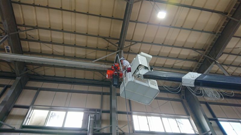長年使っているチェンブロックから「部品が落ちてきた」というお客様からの相談から、メーカーと訪問をして現地確認をしたところ、使用頻度の多さからの経年劣化も考えられ、今回新しい電気トロリ式電気チェンブロック1.5tonに交換となりました。 地上6m程の高さにレールがある為に、高所作業車を入れての入替え作業となりましたが、トロリの設置とその後のチェンブロックの設置、また電気の接続も無事に終わり、試運転をして問題なく稼働をするようになりました。 また長年使っているチェンブロックはチェン自体の伸びも考えられ、それは最悪事故に繋がりますので、今回交換することにより、お客様と伸びの確認も出来て、良い機会となりました。